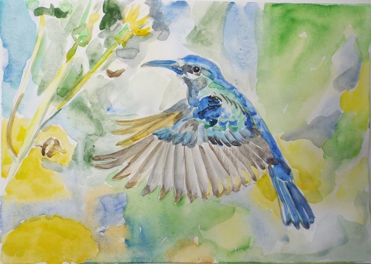 Мне очень хотелось передать этих маленьких птиц в полёте акварелью.Это птички в минуту совершают до 1200 взмахов. Это чуть ли не единственная птица которая может летать и назад и в бок и зависать на долго на месте. Колибри напоминает мне бабочек, Такие же маленькие, до 5 см , и яркие.