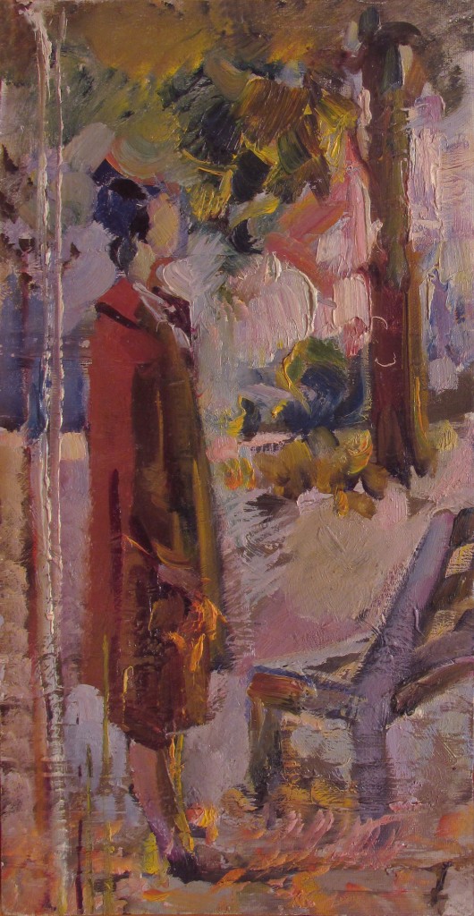 Одиноко стоящая женщина возле скамейки в осеннем парке.