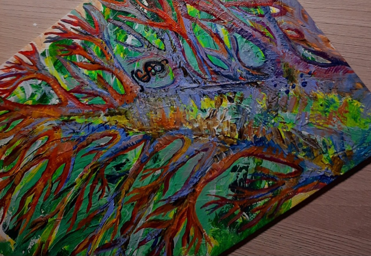 На изображении представлена картина, выполненная в абстрактном стиле. Она характеризуется яркой палитрой и выраженной текстурой, что указывает на использование техники импасто, создающей объемные мазки. Композиция картины напоминает переплетение корней или ветвей, создавая динамичное и органическое впечатление.
